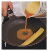 Через 15 сек. с помощью деревяных палочек или лопатки свернуть омлет в рулет и сдвинуть его на противоположный край сковороды. Вылить новую порцию яичной смеси так, чтобы она обязательно попала под уже приготовленный рулет.