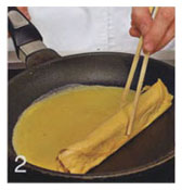 2. Через 10 сек. с помощью палочек "подкатить" на себя готовый омлет сворачивая таким образом в рулет и новую порцию. Повторять операцию до тех пор, пока не израсходуется вся яичная масса.