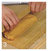 3. Выложить омлет на циновку для суши (или на лист пергамента), свернуть ее в трубочку и прижать руками. На разрезе омлет должен иметь овальную форму.