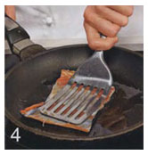4. Приготовить кожу лосося. В сковороде разогреть немного растительного масла. Прижимая кожу лосося лопаткой к сковороде, обжарить ее, по 3 мин. с каждой стороны. Снять с огня.
