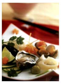 5 Кальмары, кориандр и овощи разложить на тарелке. Раскрыть устрицы и вместе с моллюсками украсить ими блюдо. По желанию блюдо подавать с кусочками лайма и пастой васаби.