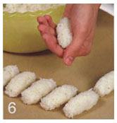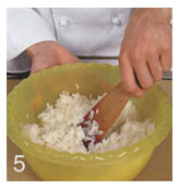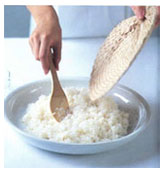 6. Введите заправку в рис деревянной лопаткой. Не перемешивайте. Вводя заправку, быстро остужайте рис, обмахивая его веером. Рис должен остыть до температуры тела, после этого из него можно готовить суши.