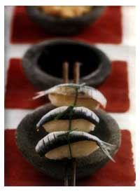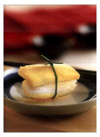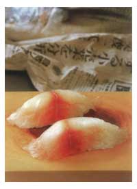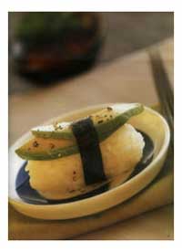 Слегка сжать нигири, одновременно прижимая сверху его кончиком левого большого пальца. Подавать с консервированной редькой.