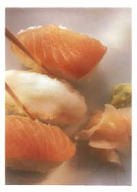 5 При приготовлении блюда следует каждый раз брать в левую руку кусочек рыбы смазанной васаби стороной вверх,