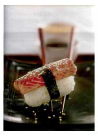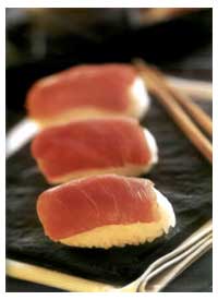 4 Каждый ломтик филе тунца положить на шарик нигири стороной, смазанной васаби, и слегка прижать.