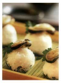 5 Шарики нигири смазать небольшим количеством васаби, положить листик петрушки и увенчать мидией.