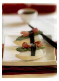 4 Положить на каждый рисовый шарик по 2 стебля спаржи. Свернуть каждый ломтик ветчины в трубочку и положить сверху на нигири.