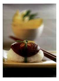 5 Из риса суши изготовить 10 шариков, каждый раз смазывая их васаби. Положить сверху на каждый шарик по кусочку филе угря.