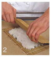 2. Сложить циновку вдвое и перевернут на другую сторону. Таким образом, рис окажется снизу, а нори сверху.