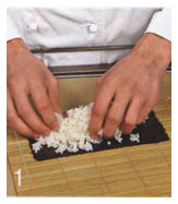 1. Лист нори разрезать на 2 части. Положить одну половинку на циновку для суши. Выложить слой риса до самых краев нори.