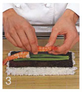 4 На лист нори нанести немного васаби. Уложить кусочки авокадо, моркови и мяса краба; добавить немного майонеза. Свернуть в рулет, внутрь которого не должна попасть пленка! Пленку удалить и украсить рулетики икрой.