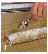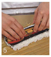 4. Свернуть рулет так, как это описано в рецепте "нори-маки". Присыпать кунжутом. Разрезать на 6 частей.
