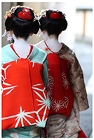 На фото минараи, обе две. Пояс у них короче того, что носят майко, примерно вдвое. А вот прическа и прочие детали - практически такие же. За месяц девушка-минараи должна привыкнуть к костюму и прическе и научится правильно их носить. Кимоно и прическа у минараи такие же, как у начинающей майко, за исключением длины пояса-оби и некоторых мелких деталей украшений.